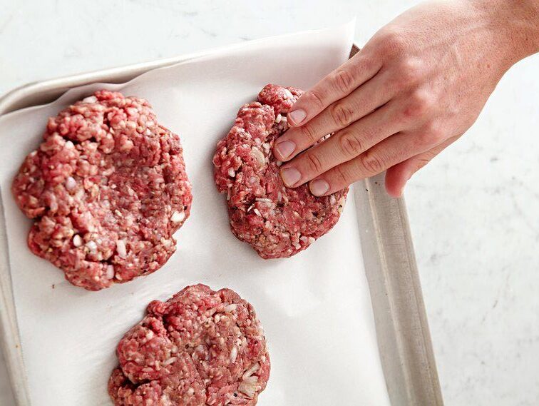 - Divide the mixture into 4 equal portions and shape them into patties about 1/2-inch thick. Pro tip: Make a small indentation in the center of each patty with your thumb to prevent them from puffing up while cooking.